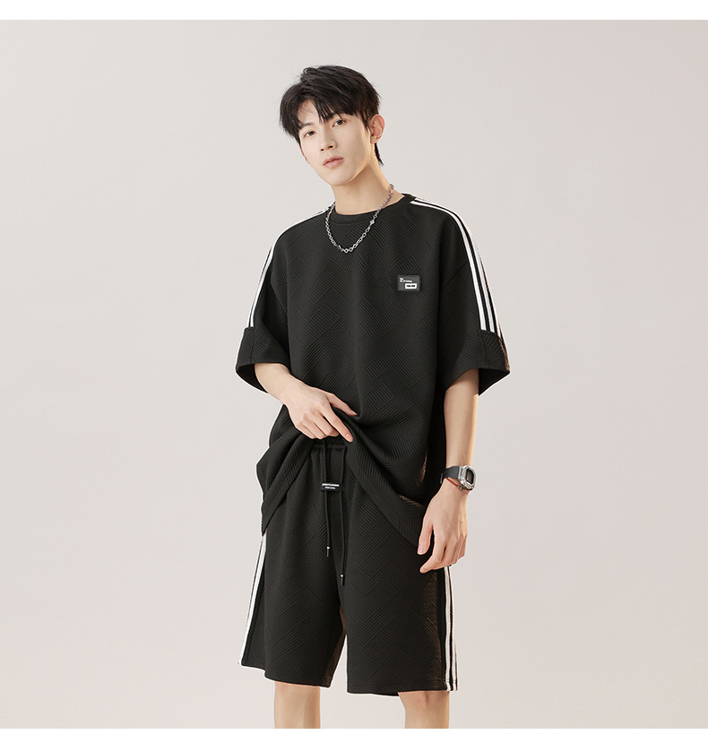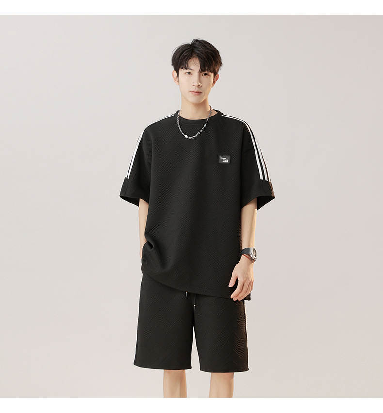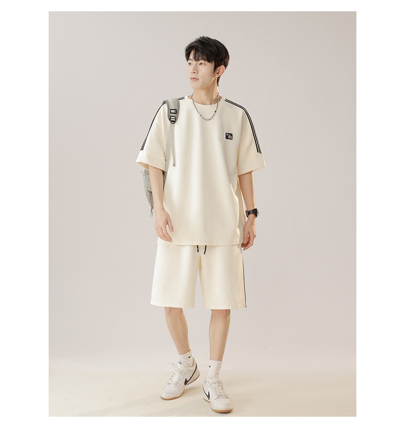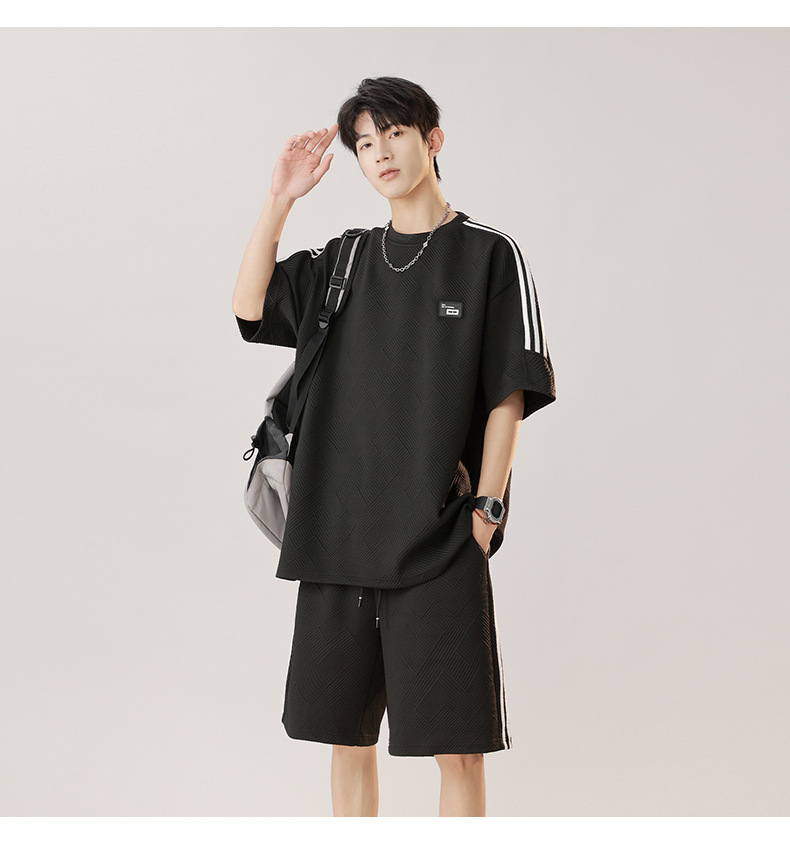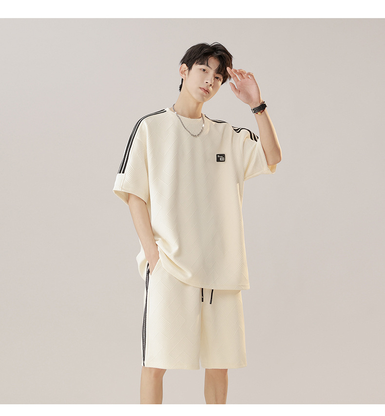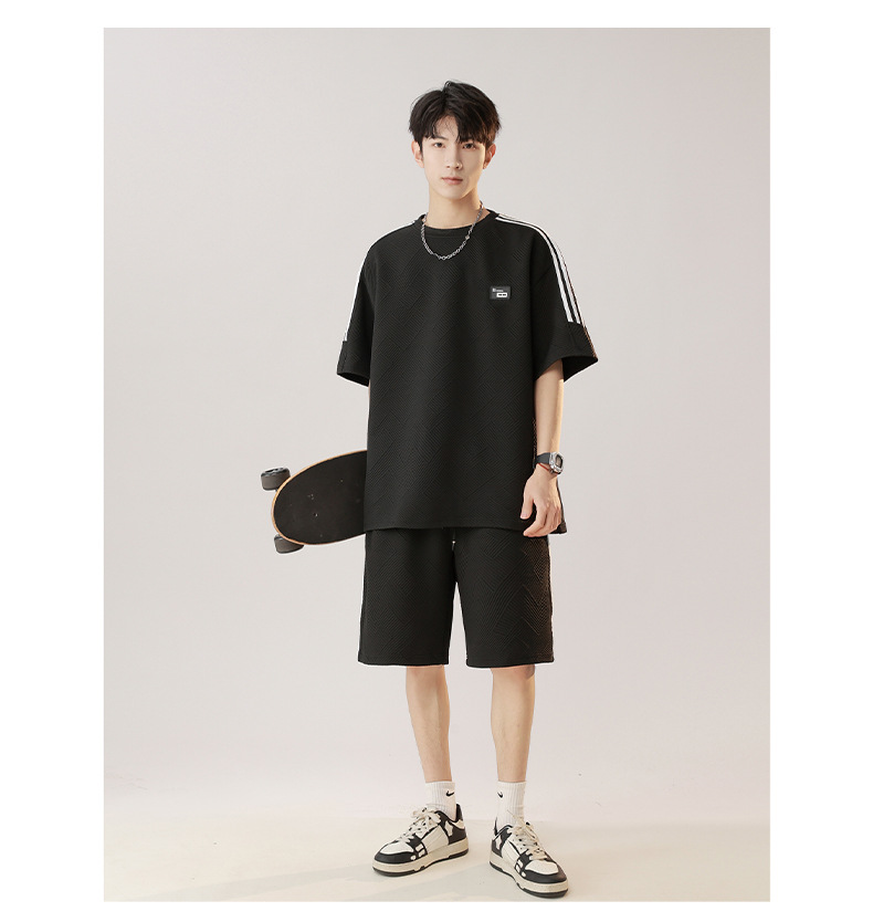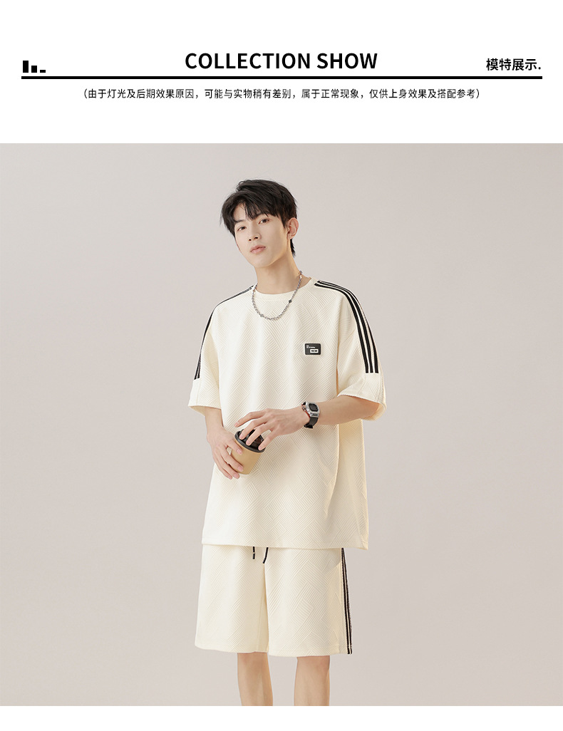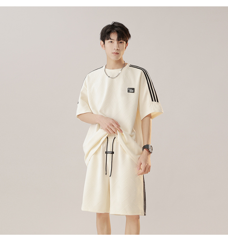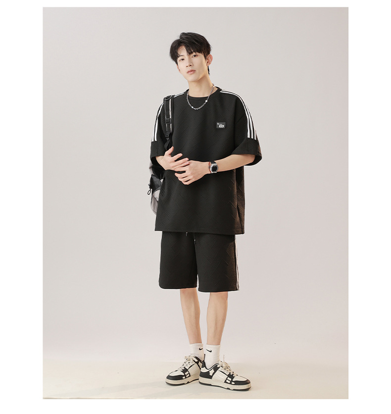 条纹拼接短袖套装男夏季潮牌美式青少年宽松运动短裤纹理感两件套