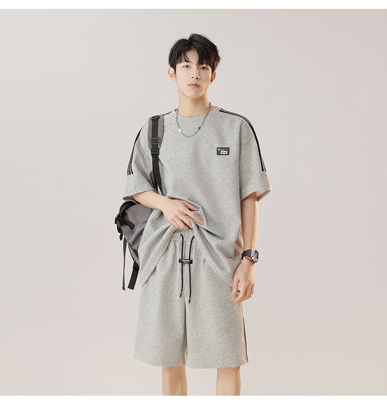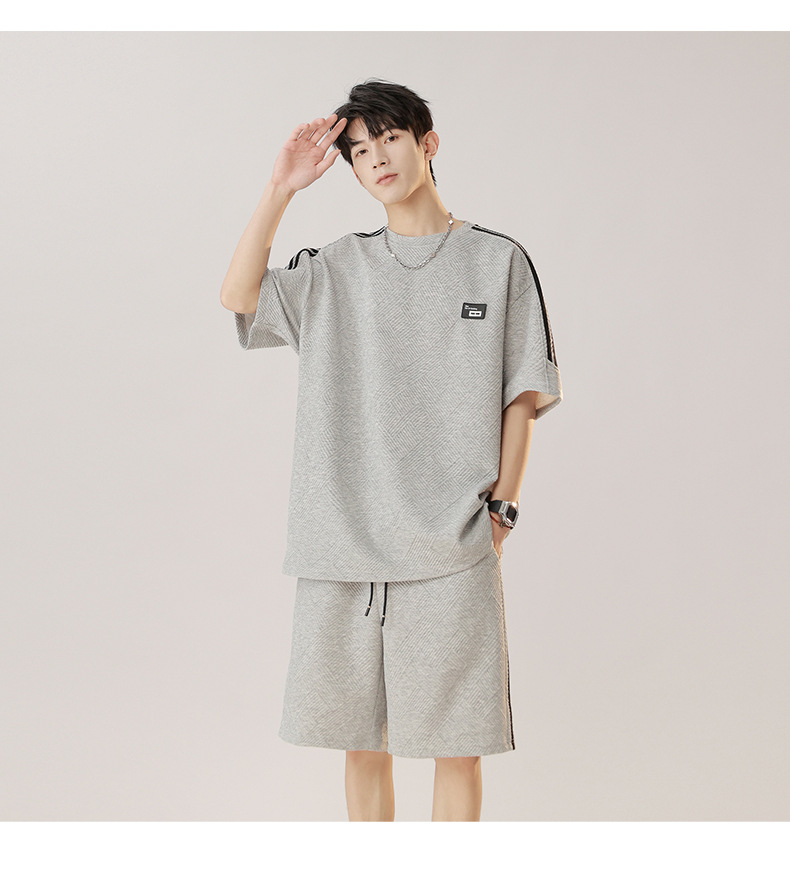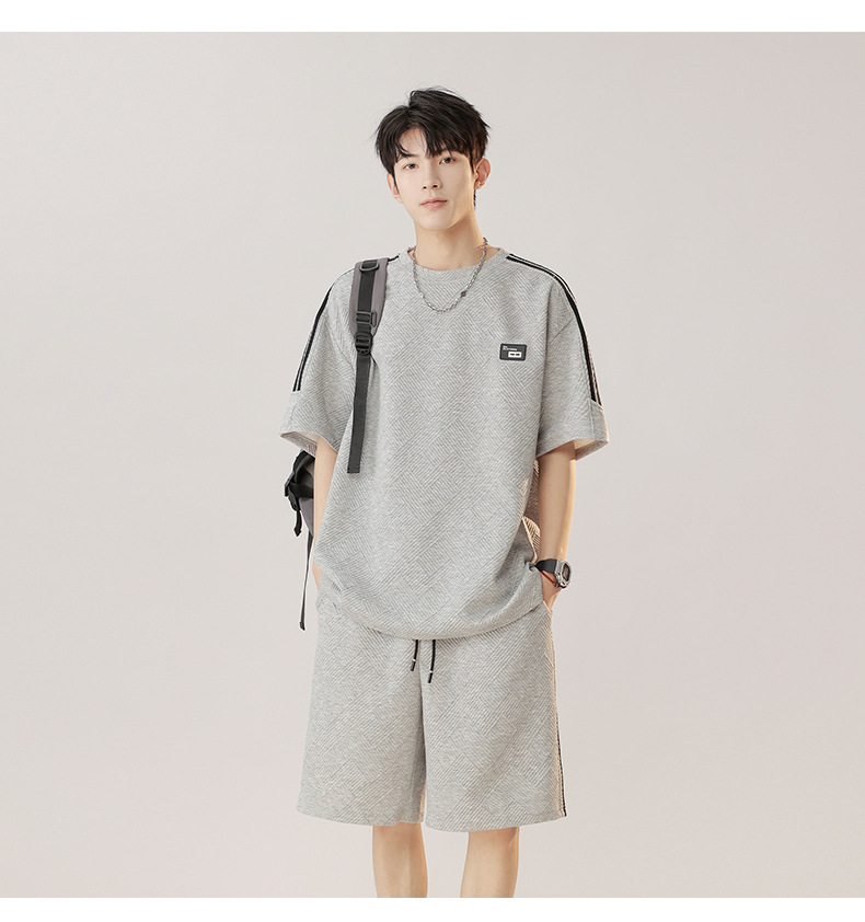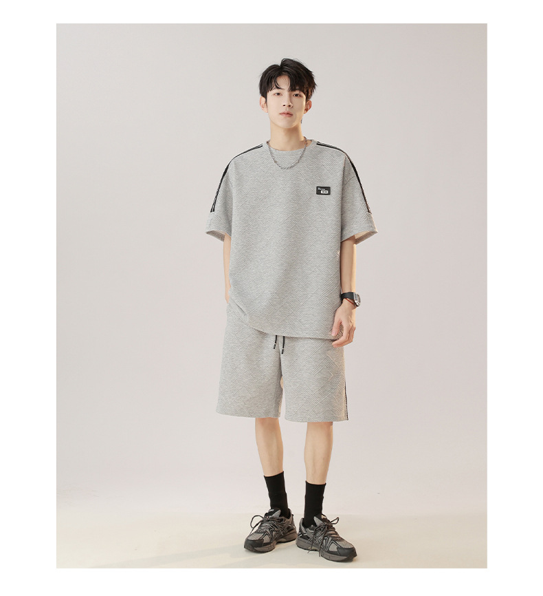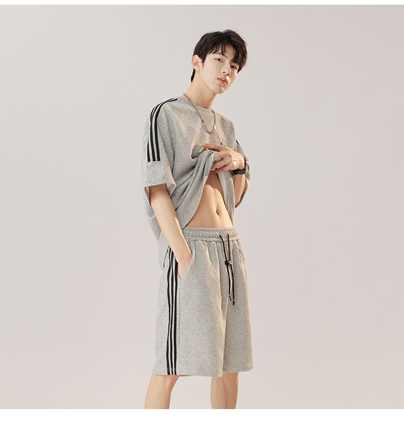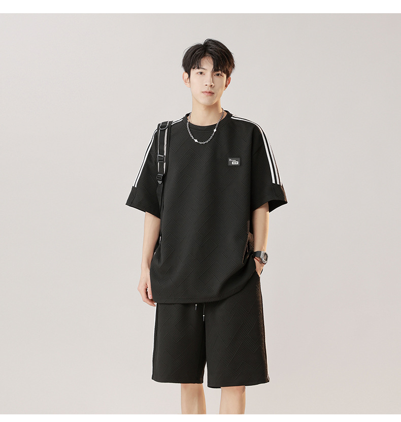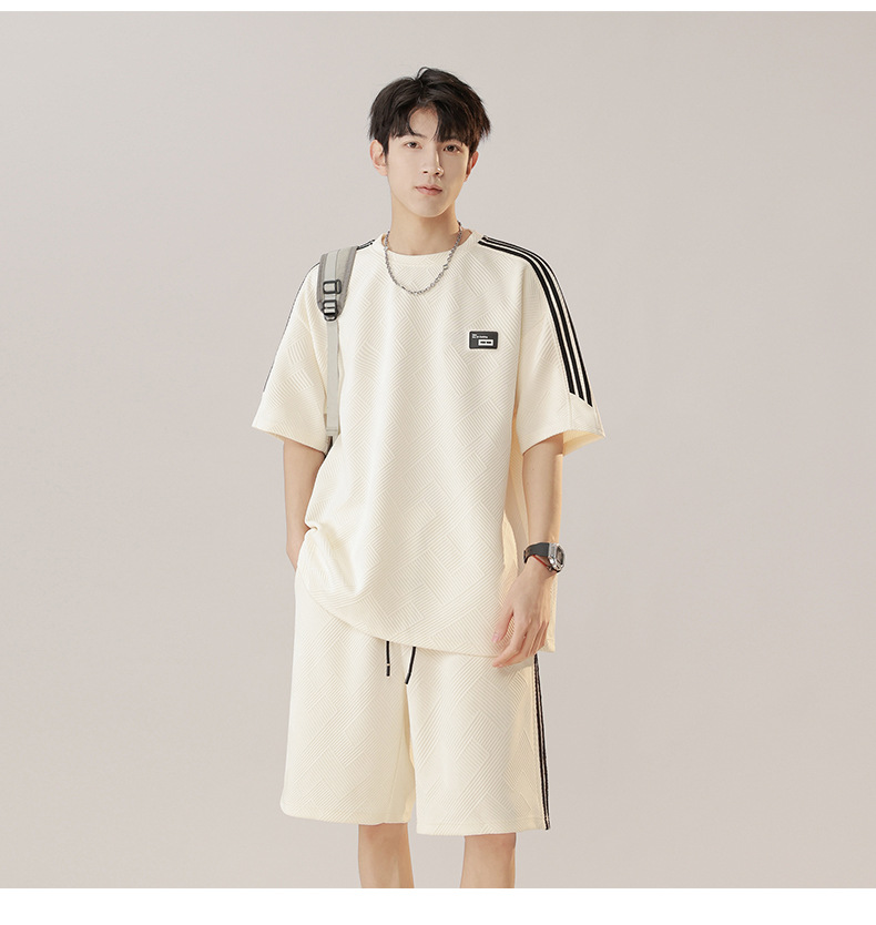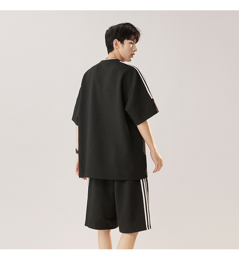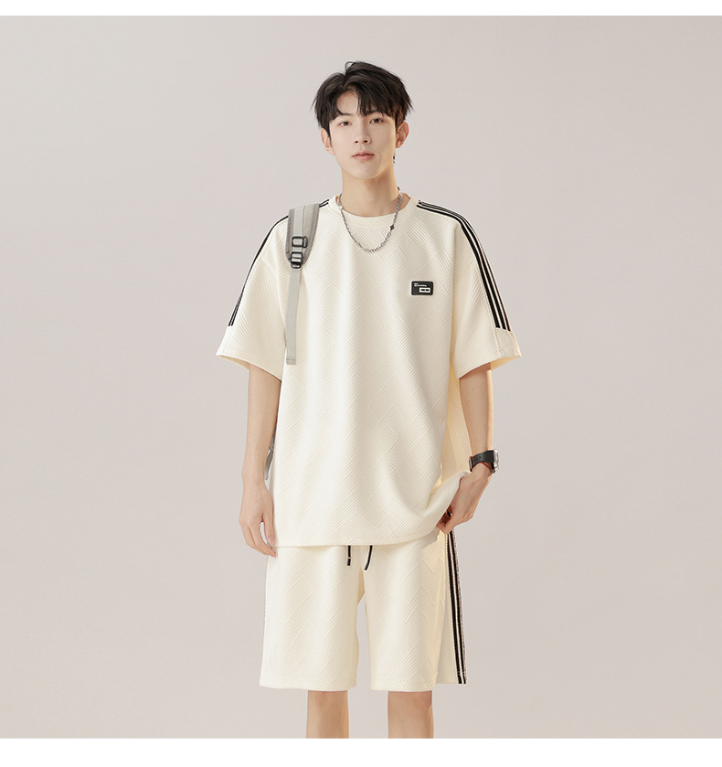 条纹拼接短袖套装男夏季潮牌美式青少年宽松运动短裤纹理感两件套