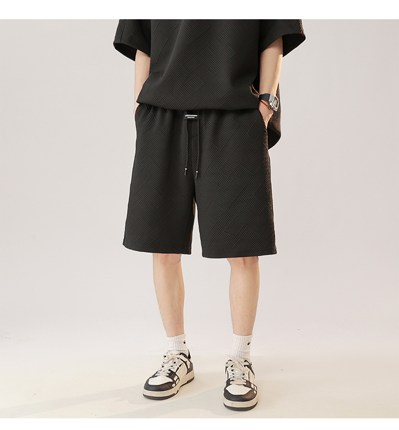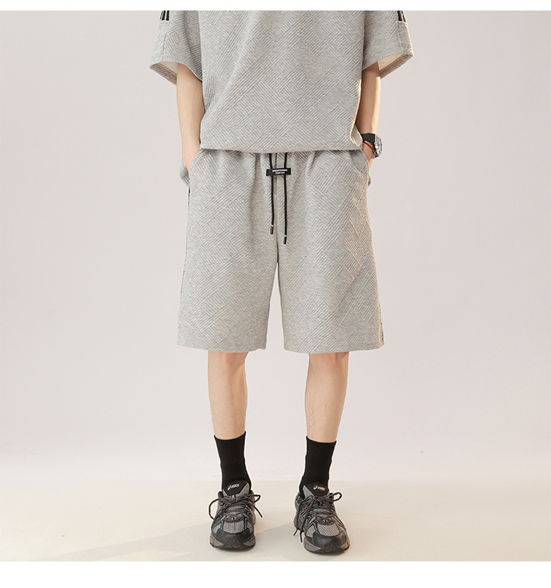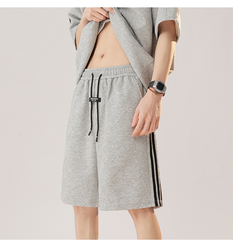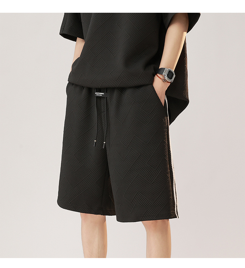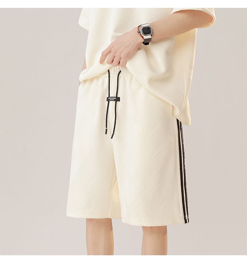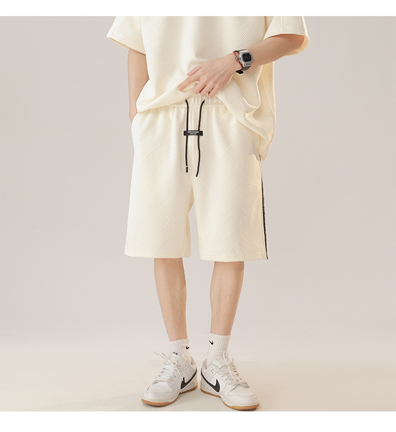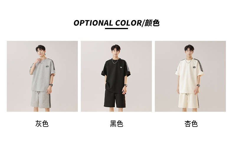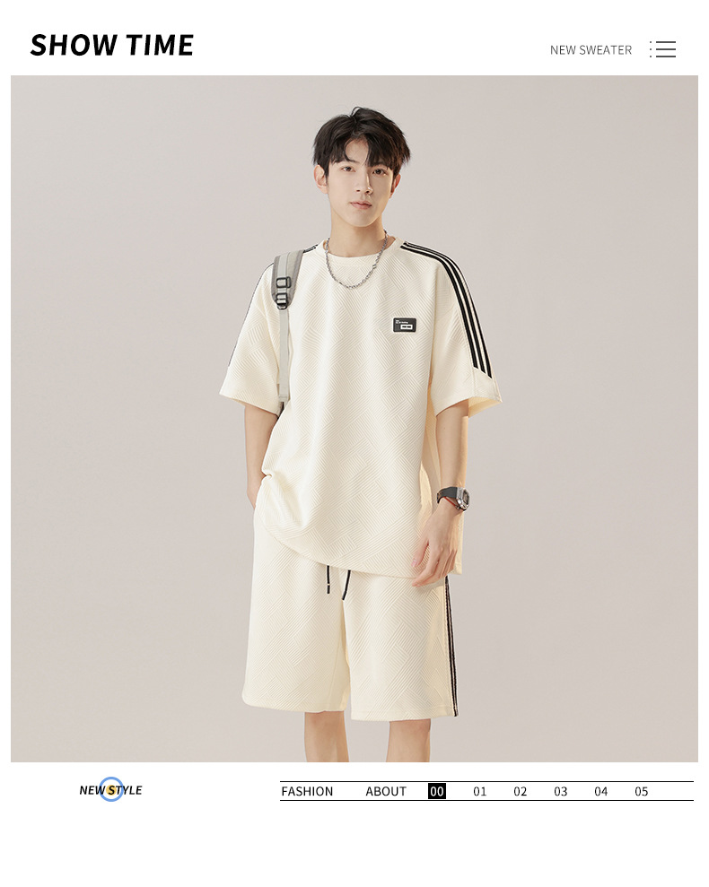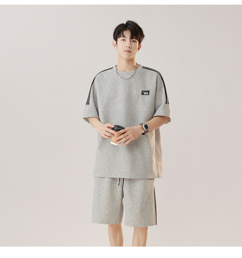 条纹拼接短袖套装男夏季潮牌美式青少年宽松运动短裤纹理感两件套