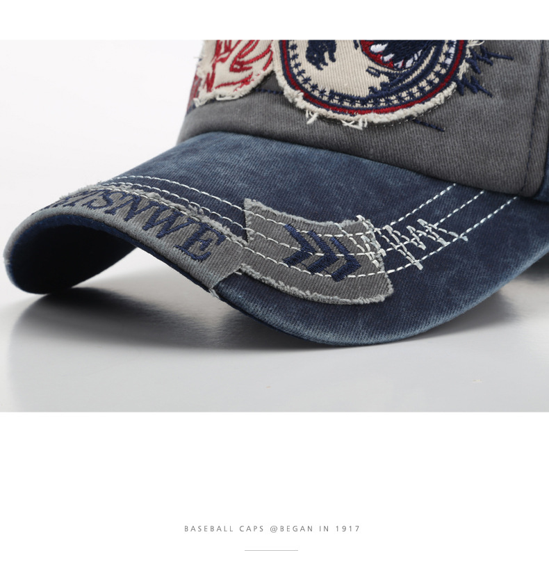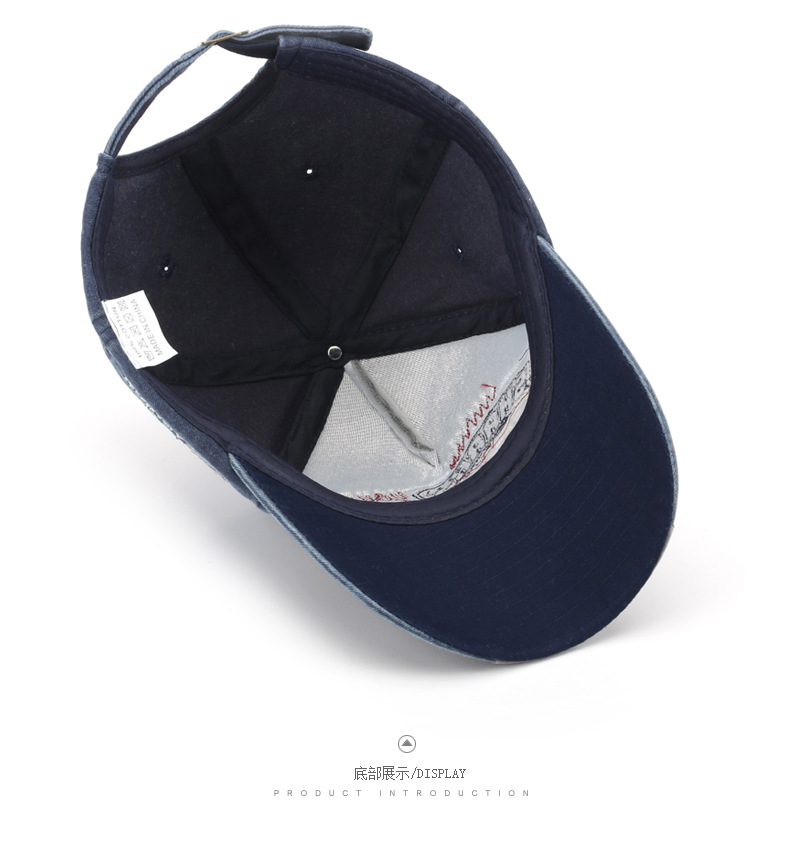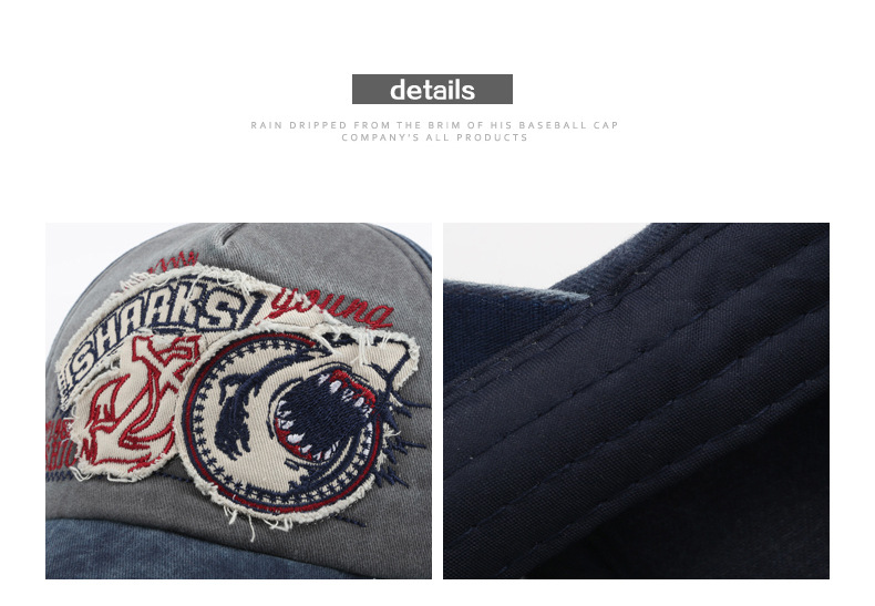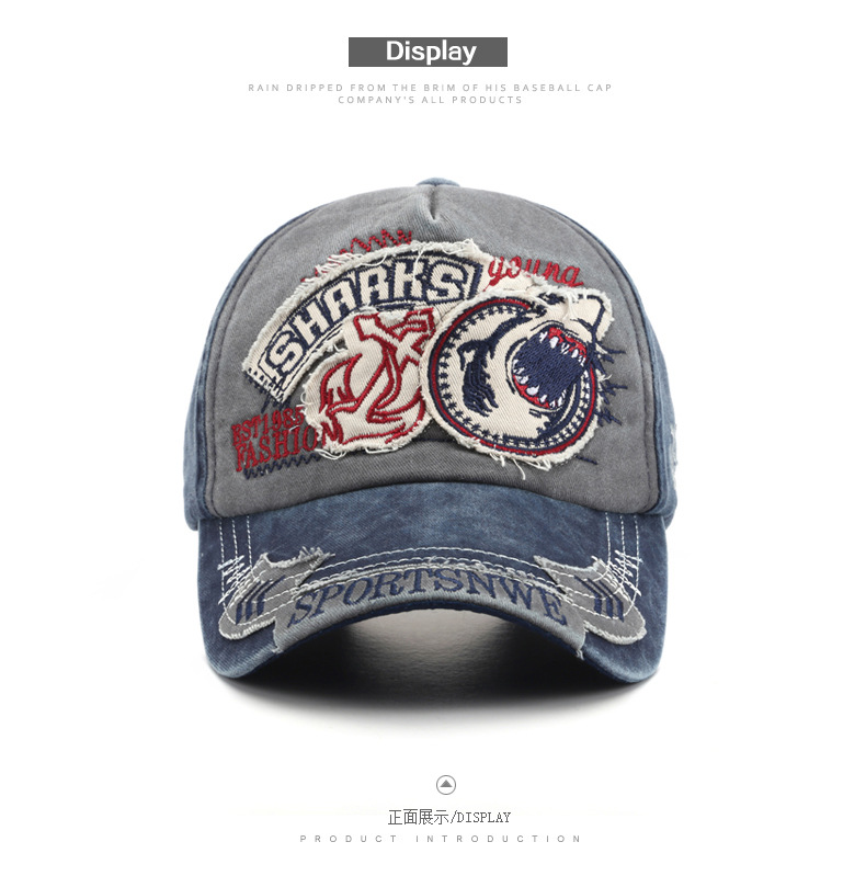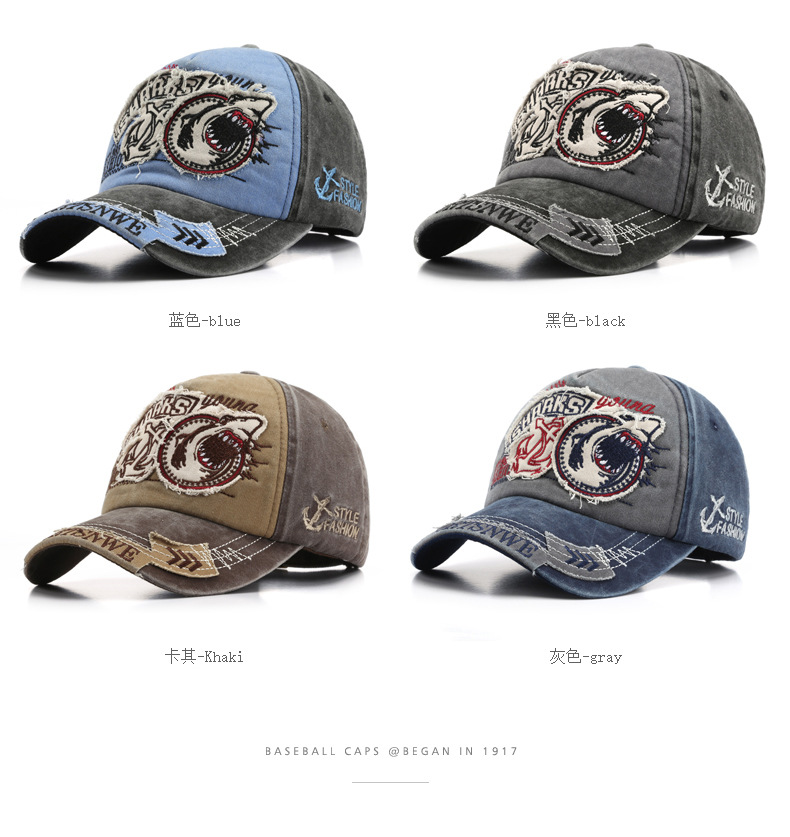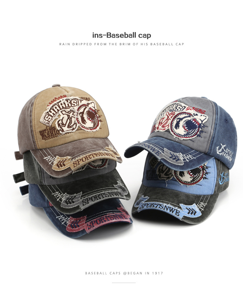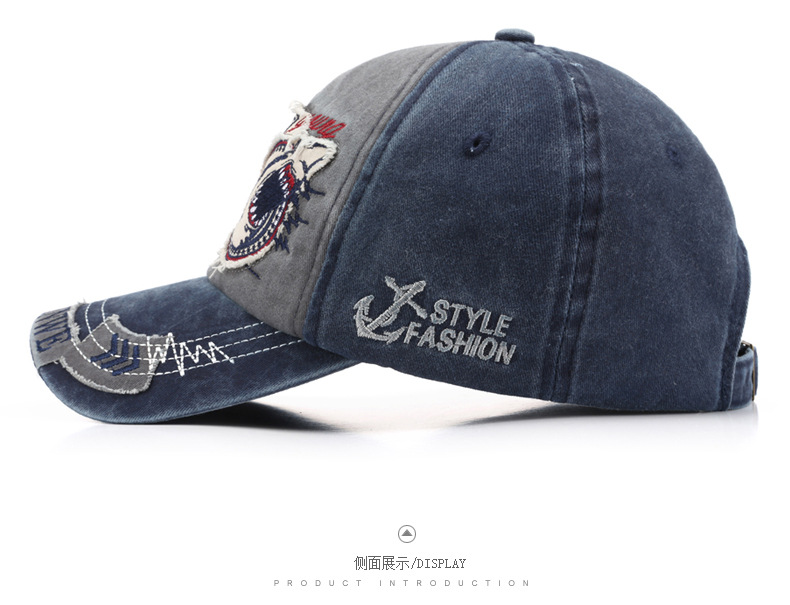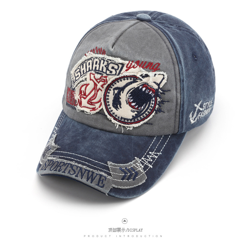 新款刺绣鲨鱼牛仔鸭舌帽做旧水洗潮男个性棒球帽女遮阳防晒帽
